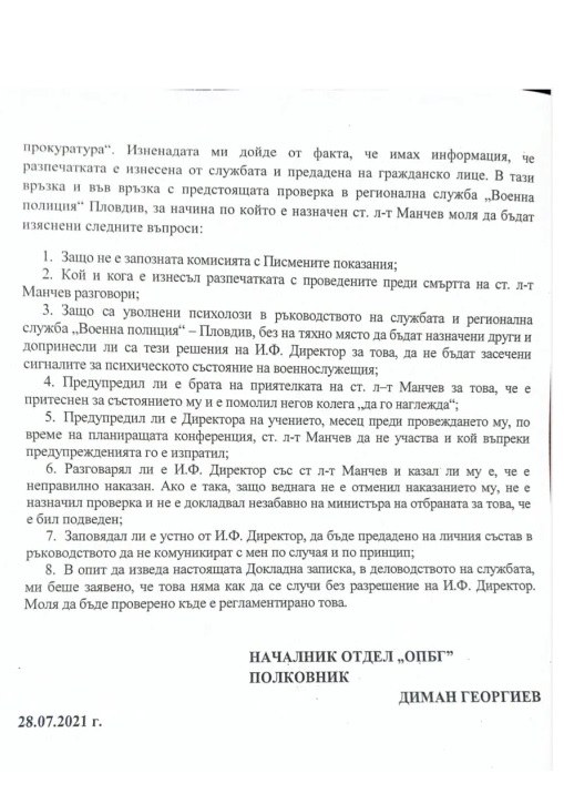 Оказва се още, че разпечатка от телефонните разговори, които Манчев е провел преди смъртта си, незаконно е била изнесена от „Военна полиция“. Данните са от съществено значение за разследването и могат да дадат отговор – дали става въпрос за склоняване към самоубийство или ст. лейтенанта е убит, при това на територията на военно поделение.