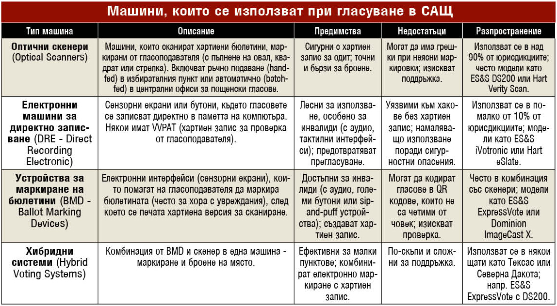 “Труд news” потърси експерти, които са проучвали различни международни практики за използване на машини. Оказа се, че с такъв тип скенери броят гласовете в САЩ, Канада, Филипини, Колумбия и Япония.