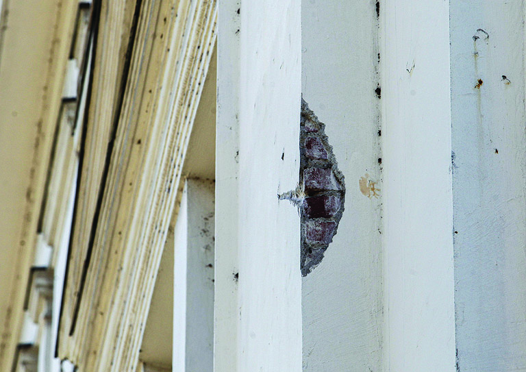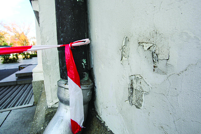 Той допълва, че са констатирани подкожушена и обрушена мазилка, цокъл с интензивни видими петна от влага, дефектирали фуги около гранитните облицовъчни плочи на сградата на пл. "Народно събрание" 2.