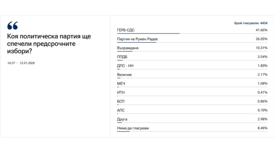 Анкетата показва, че ако предсрочни избори се проведат в близко бъдеще, те ще бъдат доминирани от сблъсък между утвърдената власт и нови или антисистемни проекти, докато голяма част от досегашните партии остават в периферията. Обществото изглежда раздвоено между желанието за управленска предвидимост и нуждата от радикална промяна, а резултатът от този сблъсък ще определи не само състава на следващия парламент, но и посоката на страната в условията на продължаваща политическа нестабилност.
