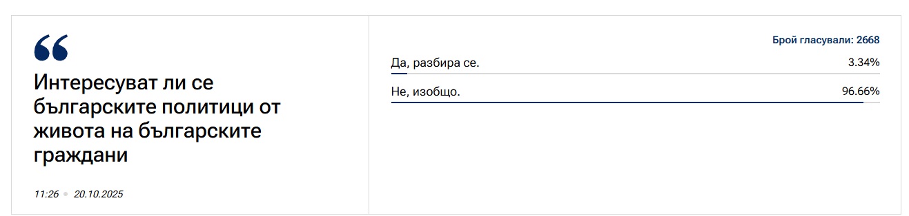 Гражданите усещат липсата на искрен интерес, конкретни действия и лична отговорност от страна на управляващите. Това недоверие може да се превърне в най-силния политически фактор – апатията, която лишава изборите от смисъл. Резултатът от анкетата на „Труд Нюз“ е тревожен, но и ясен. Българите не вярват, че някой във властта се интересува от тях. Докато разликата между обикновения живот и политическия елит се задълбочава, обществото все повече възприема държавата като чужд организъм.