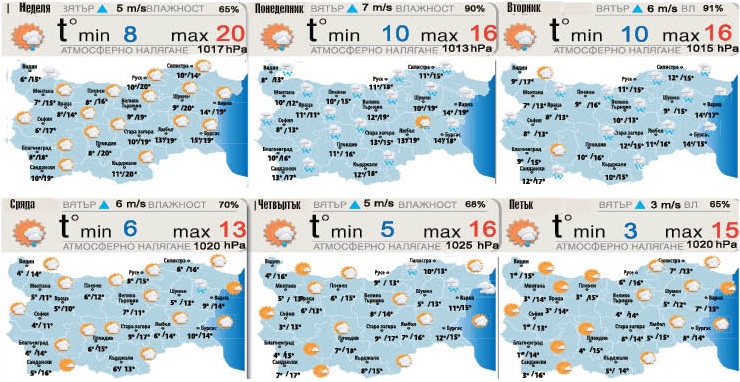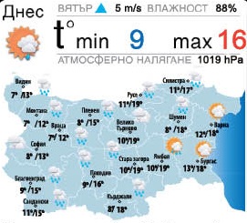 Минималните температури ще бъдат от 7 до 12 градуса, по Черноморието до 12 градуса. През деня ще се задържи облачно. От запад облачността ще се уплътнява и следобед ще вали в западните части от страната. През нощта, срещу неделя, облаците от запад на изток ще се разкъсват. Вятърът ще е слаб (скорости до 20 км/час) от югоизток. По високите части на планините ще духат до умерени ветрове от юг (скорости до 25 км/час). Максимални температури от 12 до 18 градуса. По Черноморието дневните температури ще бъдат до 18 градуса, за района на София 12 градуса.