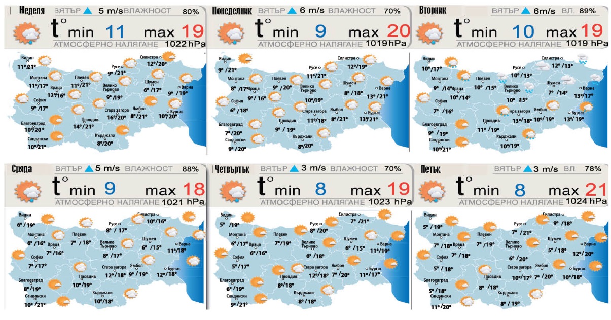 Минималните температури ще бъдат от 15 до 9 градуса, по Черноморието: до 14 градуса. Облачността ще бъде променлива, но значителна, предиобед със слаби валежи над центраните и над източните райони. Следобед валежите ще спират, облаците ще намаляват. Вятър - до умерен (скорости до 25 км/час) от северозапад. По високите части на планините ще духат свежи до засилени ветрове от северозапад (скорости до 60 км/час). Максимални температури от 16 до 21 градуса. По Черноморието дневни темпеатури до 17 градуса, за района на София 16 градуса.