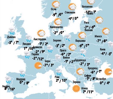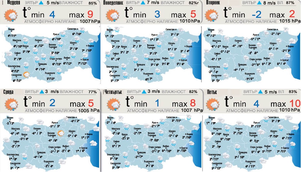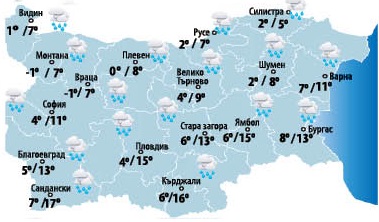 Минималните температури в населените места ще бъдат от 2 до 8 градуса, по Черноморието до 7 градуса. През деня дъждовно , с валежи главно в западните и южните райони, късно следобед и в Дунавската равнина. Нова снежна покривка в планините в рамките на 1 до 3 см. Вятър - слаб, (скорости до 20 километра в час), от запад- югозапад.По високите части на планините ще духат свежи ветрове от запад (скорости до 40 километра в час).