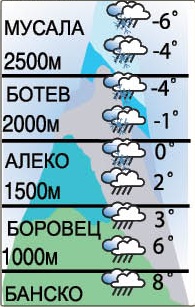 Максимални температури за деня - над 2500 /метра /височина - около -7 до -4 градуса, а на 1500 /метра/ - от 2, до 4 градуса.