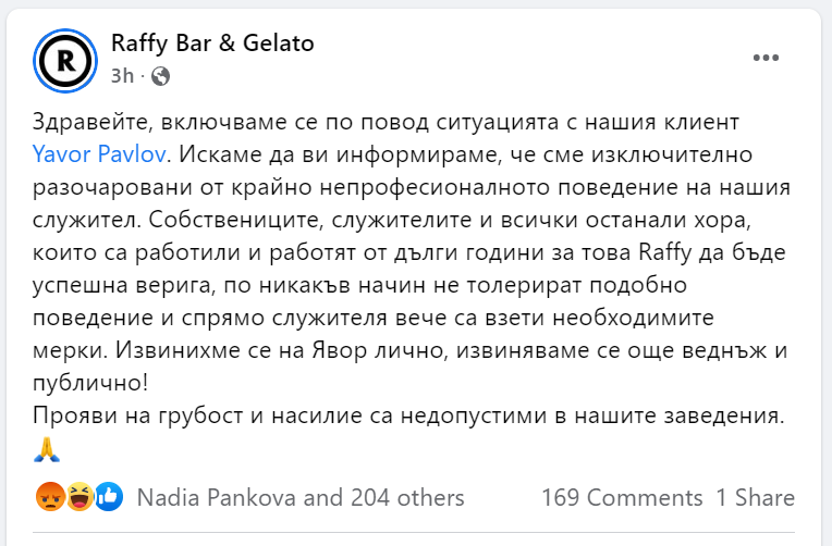 От Raffy Bar & Gelato публикуваха обяснение, в което признават за инцидента и заявяват, че са "изключително разочаровани от крайно непрофесионалното поведение на нашия служител".