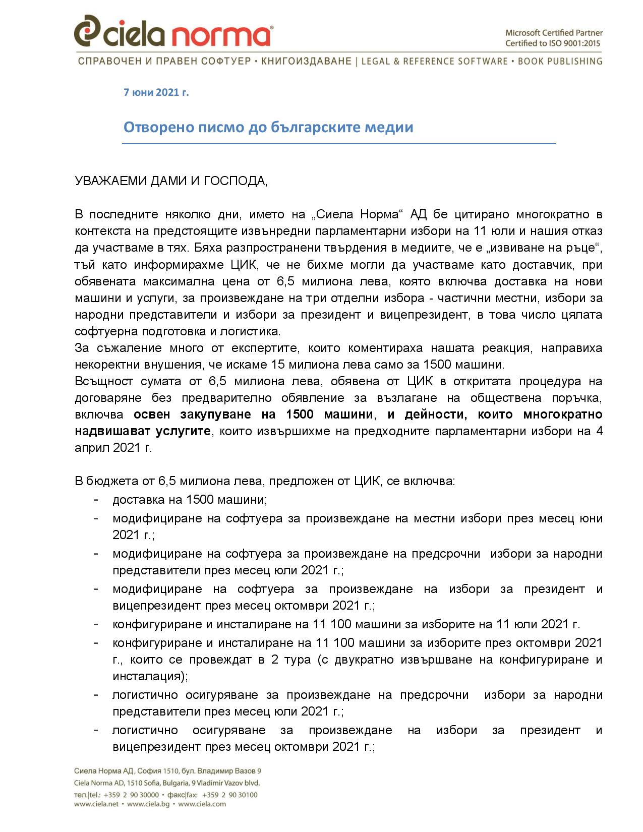 За съжаление много от експертите, които коментираха нашата реакция, направиха некоректни внушения, че искаме 15 милиона лева само за 1500 машини, заявиха от "Сиела Норма" в отворено писмо до медиите.
