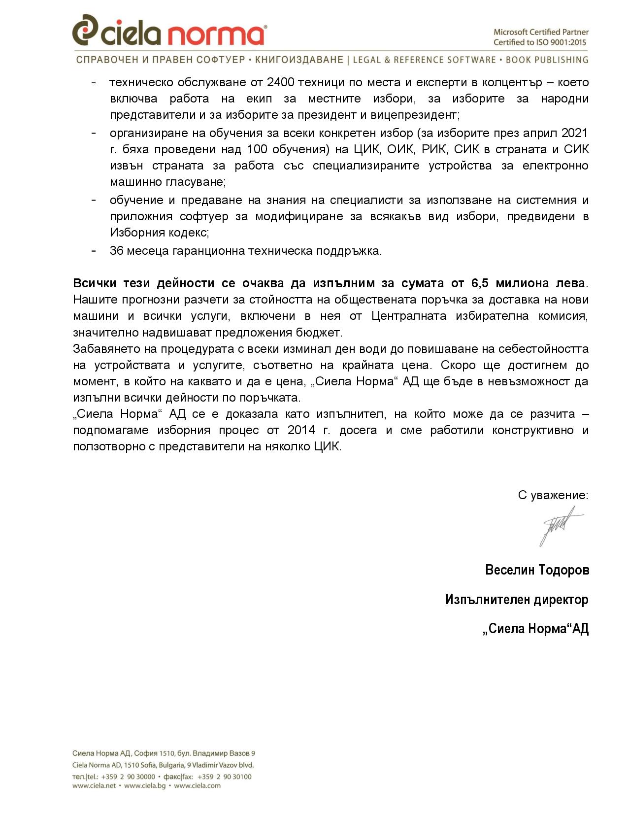 "Всъщност сумата от 6,5 милиона лева, обявена от ЦИК в откритата процедура на договаряне без предварително обявление за възлагане на обществена поръчка, включва освен закупуване на 1500 машини, и дейности, които многократно надвишават услугите, които извършихме на предходните парламентарни избори на 4 април 2021 г.", пишат от фирмата и прилагат списък.