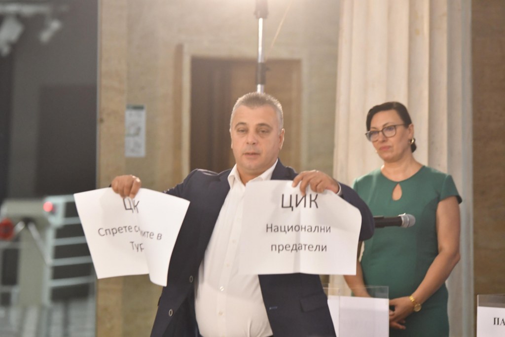 В началото на събитието Ангелов застана пред трибуната с урните и попита членовете на ЦИК „кога ще спрат гласовете от Турция”. Той държеше в ръце и два листа с надписи: „Спрете секциите в Турция” и „ЦИК – национални предатели”.
