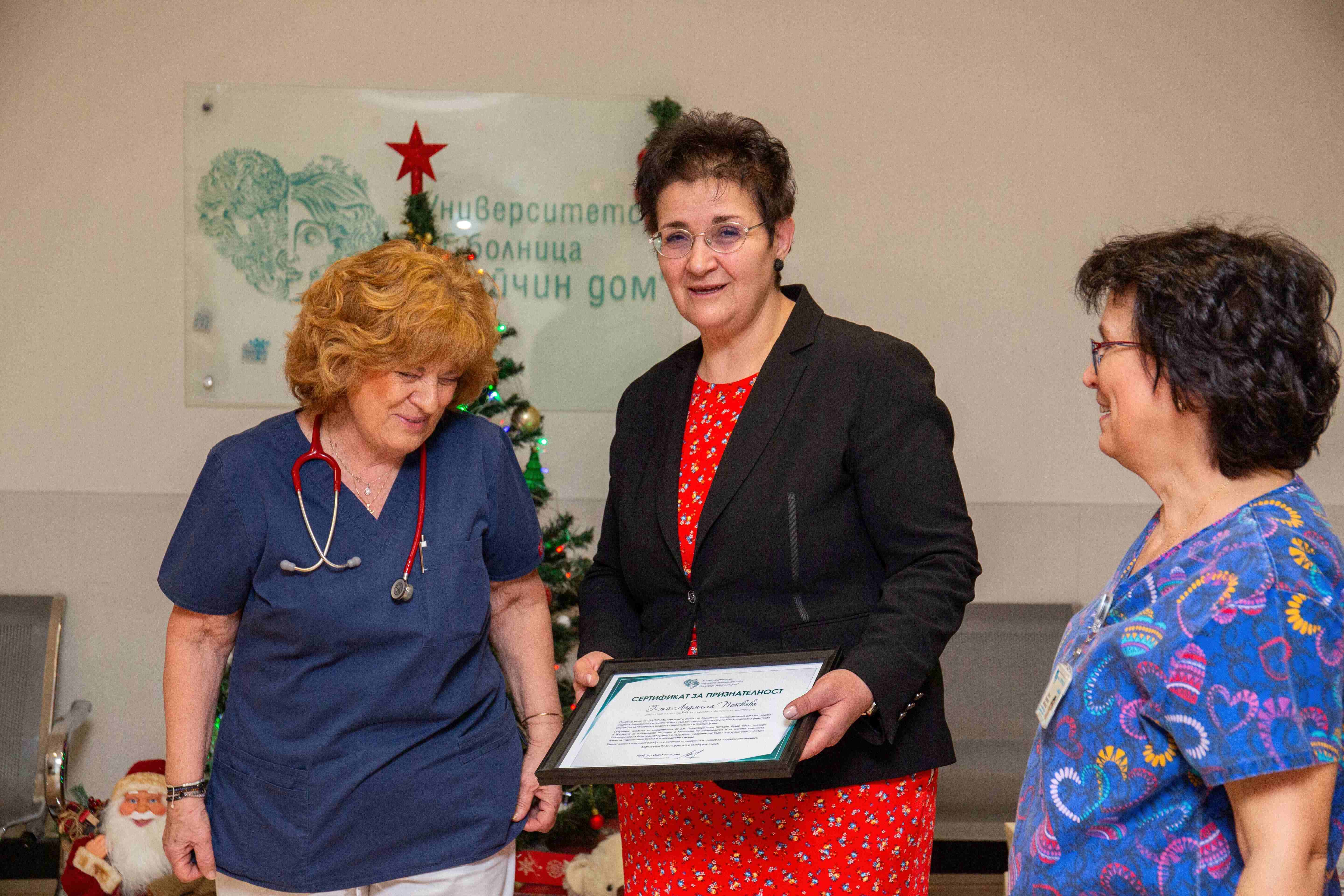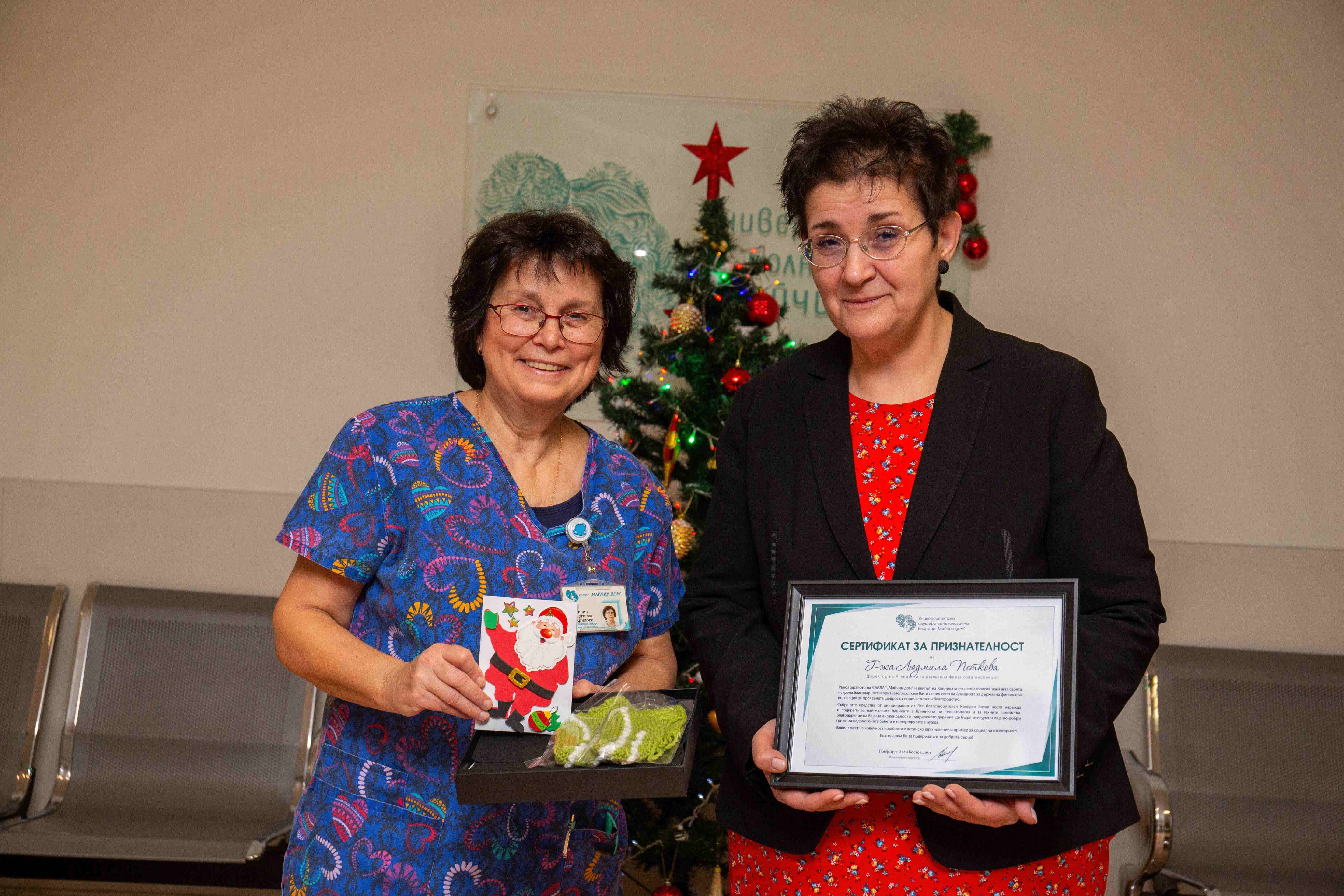 Събрани бяха общо 5 445 лева, които г-жа Людмила Петкова дари лично на доц. д-р Лилия Вакрилова – началник на Клиниката по неонатология в СБАЛАГ „Майчин дом“, и на проф. д-р Боряна Слънчева, дългогодишен ръководител на клиниката.