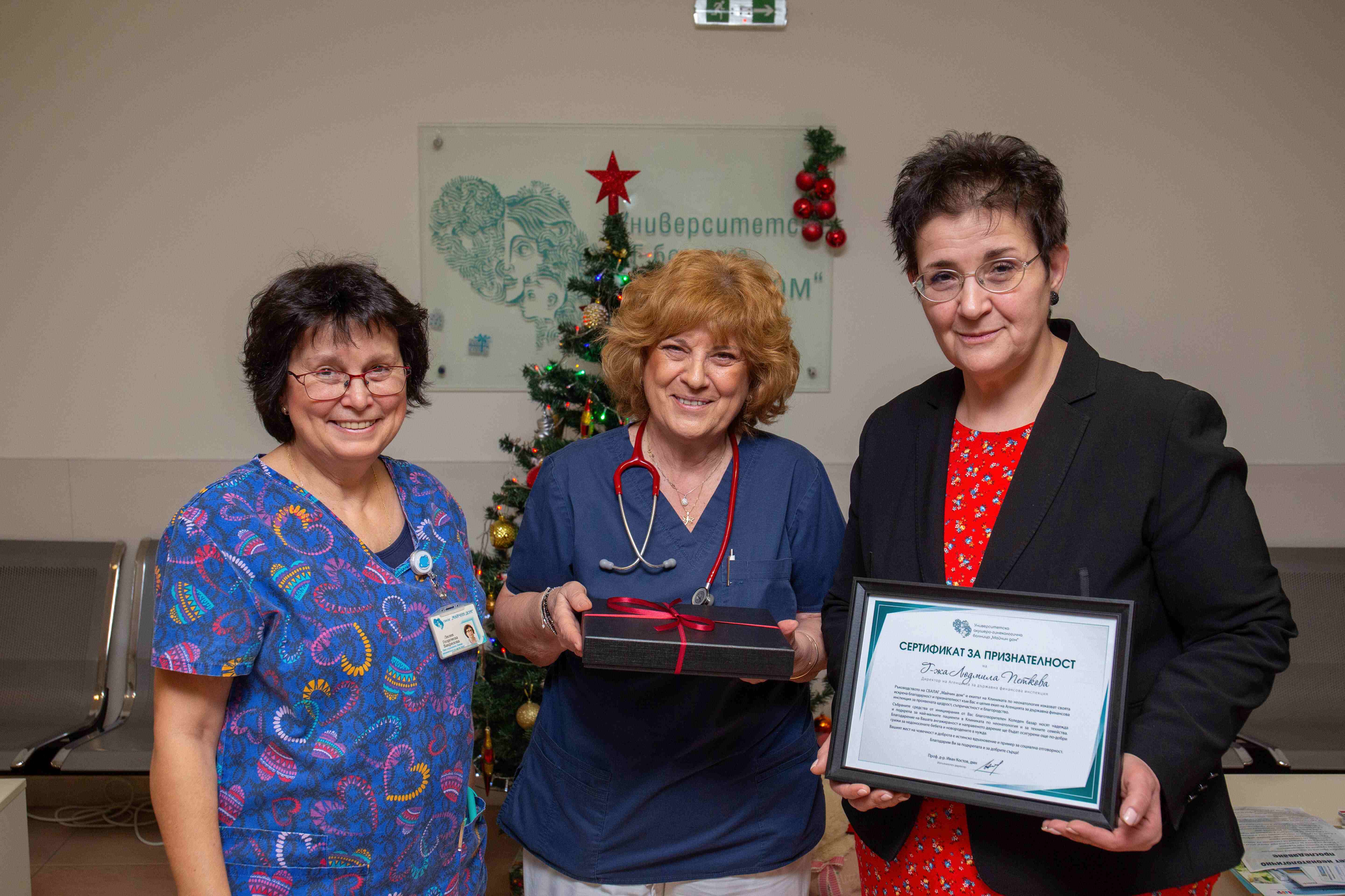 „За нашия екип това дарение е изключително ценно. То е не само финансова подкрепа, но и силен знак на съпричастност и доверие към работата ни. Всяка подобна помощ ни дава възможност да осигурим по-добра грижа за най-малките и най-рисковите ни пациенти – недоносените бебета. През Клиниката по неонатология в СБАЛАГ „Майчин дом“ годишно преминават най-много новородени в страната – между 700 и 800 новороден, които имат нужда от интентивни грижи и лечение. За тях всяка грижа, всеки апарат и всяка подкрепа могат да бъдат животоспасяващи. Искрено благодарим на ръководството и служителите на Агенцията за държавна финансова инспекция за проявената човечност и ангажираност към тази кауза,“ изрази признателност доц. д-р Лилия Вакрилова, началник на Клиниката по неонатология.