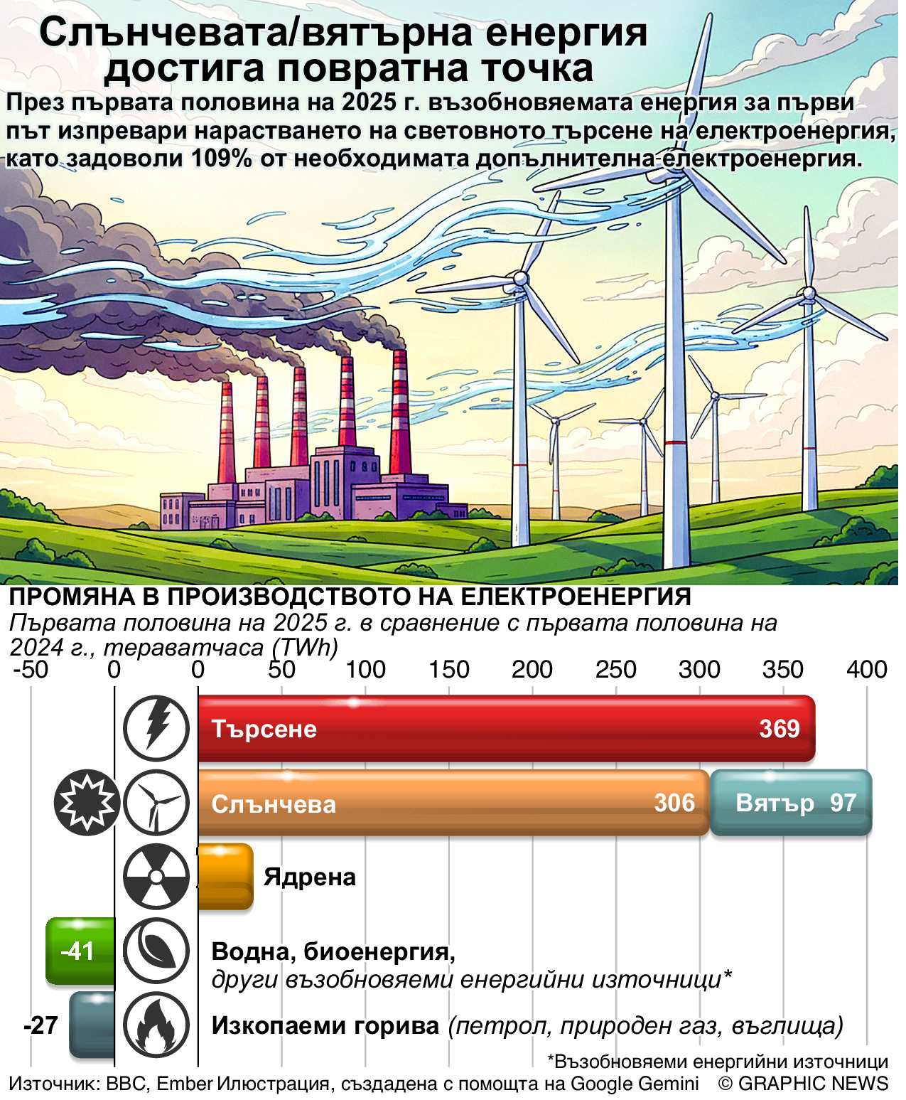 През първата половина на 2025 г. възобновяемата енергия изпревари нарастването на световното търсене на електроенергия – исторически първи и „ключов поврат“, според нов доклад на глобалния енергиен мозъчен тръст Ember. С нарастването на световното търсене на електроенергия се увеличава и растежът на слънчевата и вятърната енергия, като те покриват 109% от допълнително необходимата електроенергия.