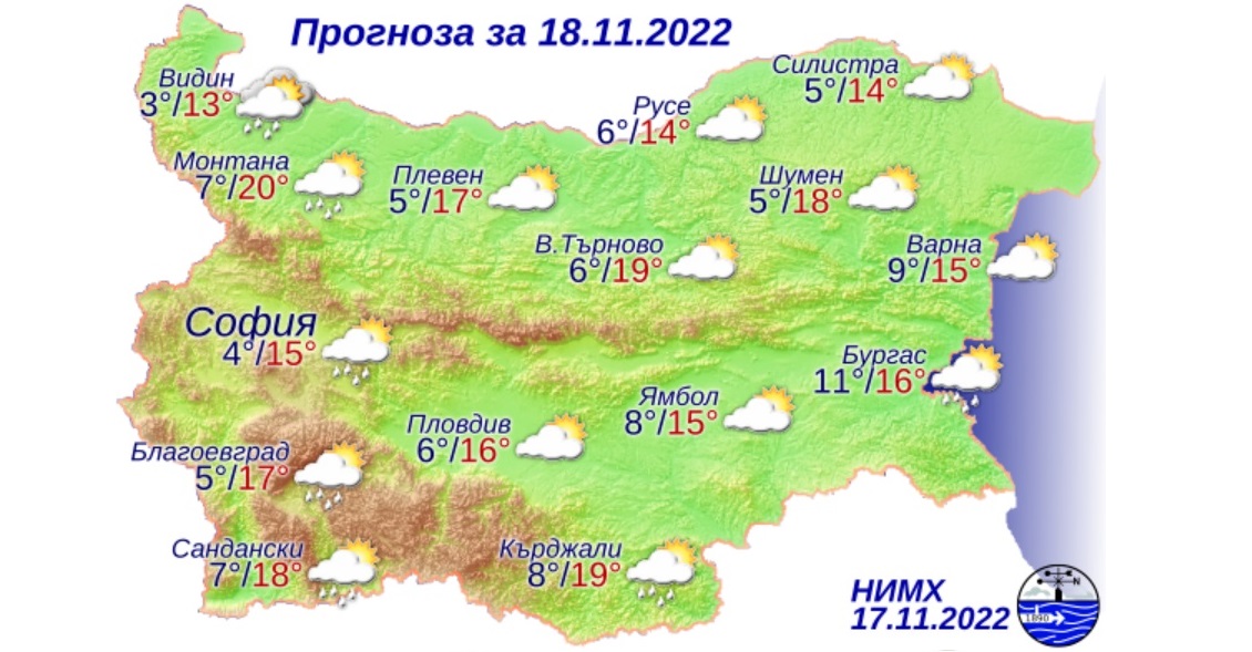 Според прогнозата на НИМХ, след обяд и вечерта в петък на места в Западна България ще превали дъжд, а от югозапад ще нахлуе топъл въздух. Очакват се максимални температури до 20° по Целзий, а в София - около 15°.