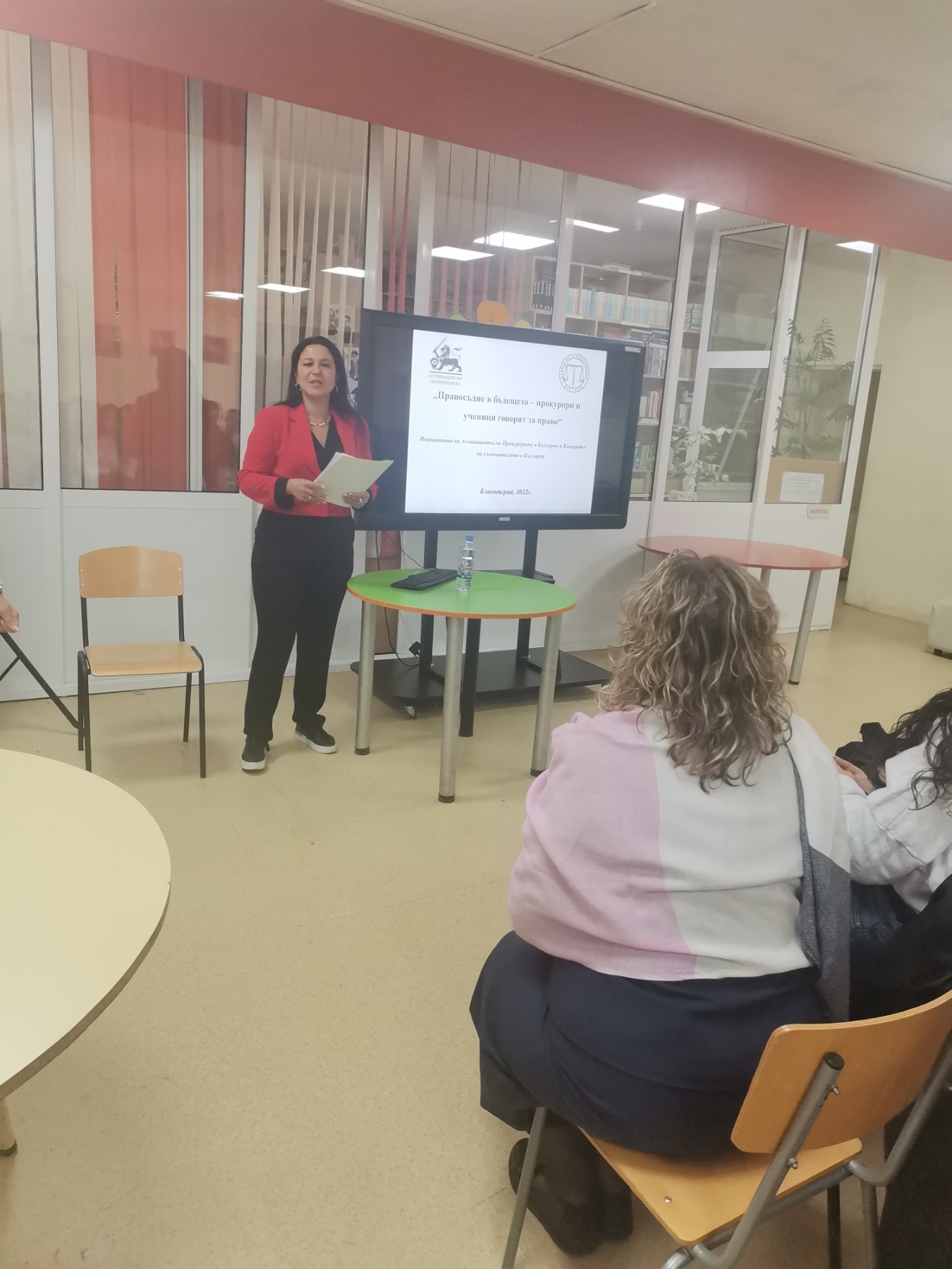 Структурата и функциите на прокуратурата, както и отговори на въпроса в кои случаи следва непълнолетните да се обръщат към прокуратурата, представи прокурор Елица Калпачка, зам.-административен ръководител на Районна прокуратура-Благоевград и член на УС на Асоциацията на прокурорите в България, пред ученици в града.