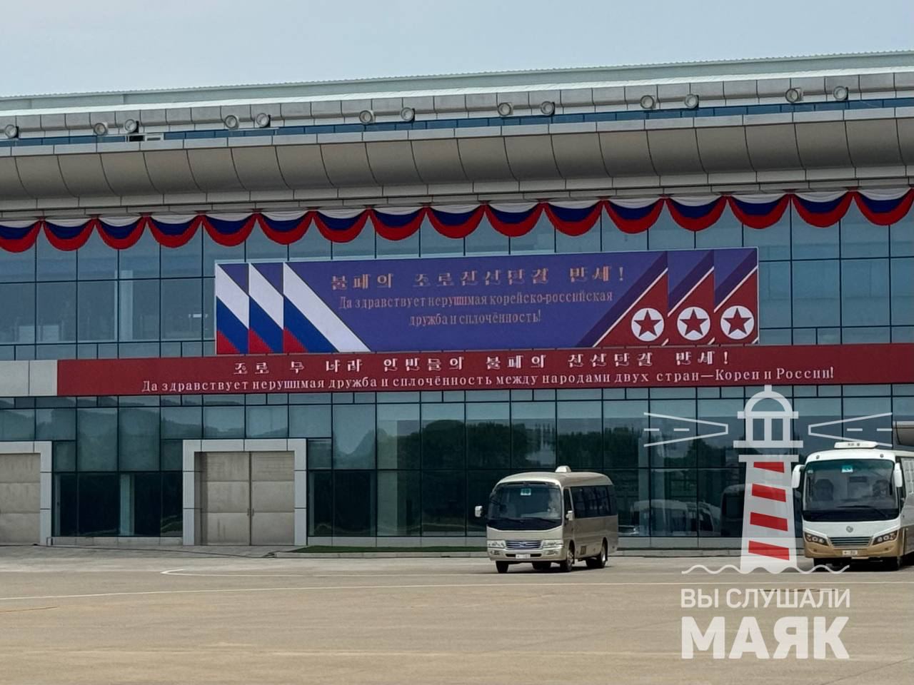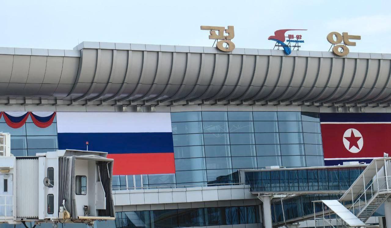 „Приятелството между Северна Корея и Русия е вечно“, гласи един банер пред международното летище Сунан в Пхенян.