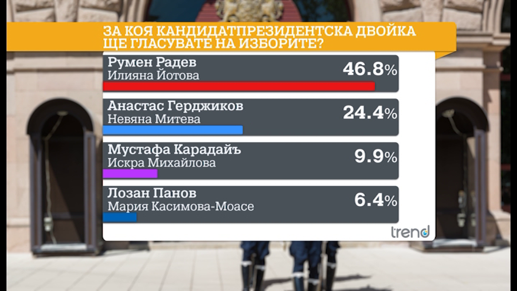 За президентския вот Ганев посочи, че вероятността за балотаж е голяма. „За да се стигне дотам трябва да бъдат изпълнени две условия. Да има над 50% активност по списъчен състав, което означава - над 3 350 000 избиратели, гласували за държавен глава. И второто - някой от кандидатите да има над 50% от всички гласове”, каза социологът и добави, че Румен Радев влиза като фаворит на втория тур. Възможността за обрат, по думите му, е малка.