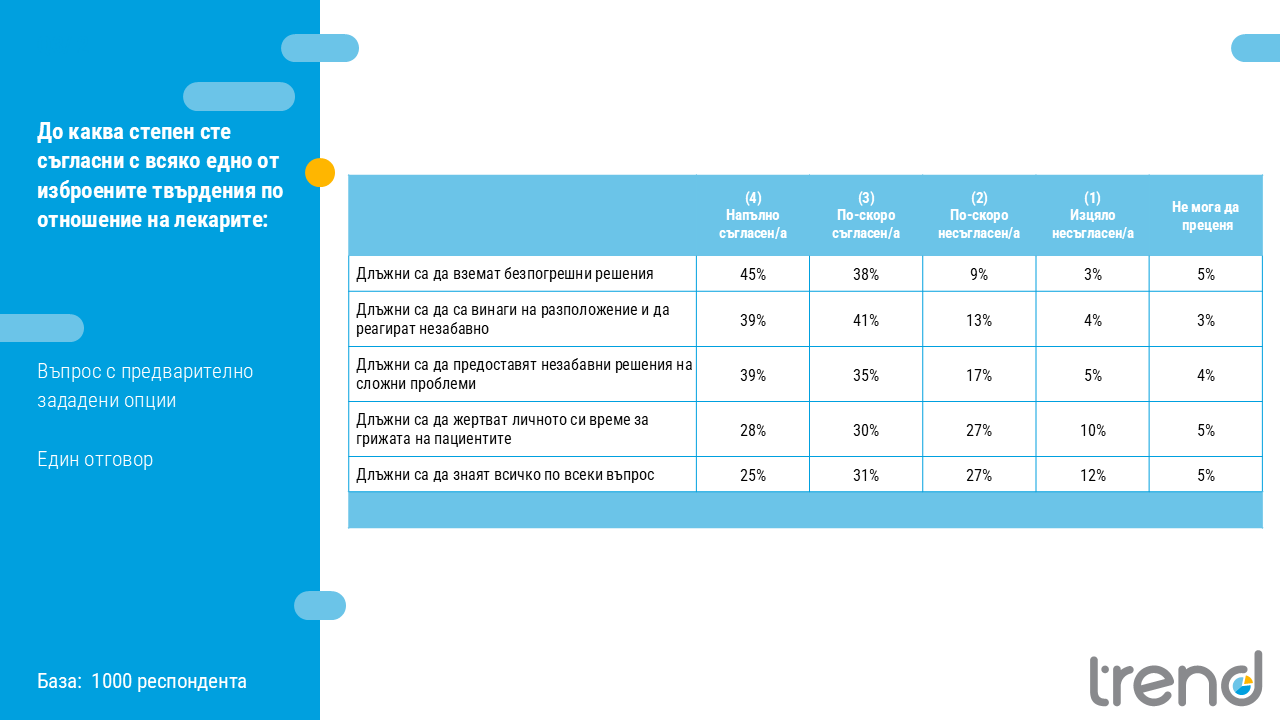В същото време обществото има свръх очаквания към медиците. Общо 83% от участниците в проучването са по-скоро или напълно съгласни с твърдението, че лекарите са длъжни да взимат безпогрешни решения, 80 % смятат до някаква степен, че лекарите са длъжни винаги да са на разположение и да реагират незабавно, а 74% – че са длъжни да предоставят незабавни решения на сложни проблеми. Над половината от участниците очакват лекарите да знаят всичко по всеки въпрос, а 48 на сто очакват лекарите да жертват личното си време за грижата за пациентите.