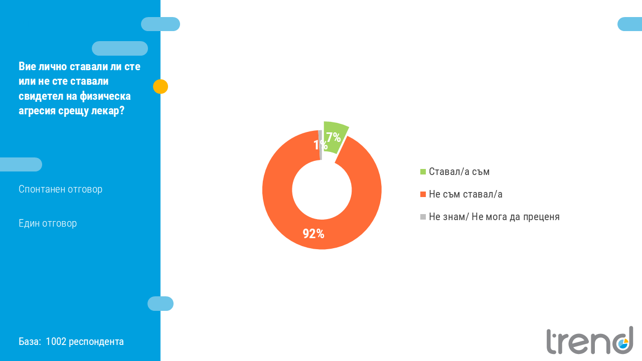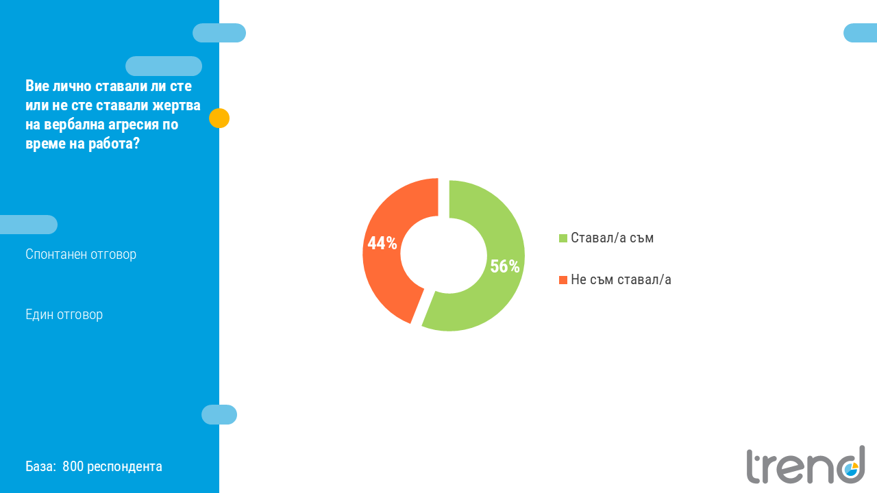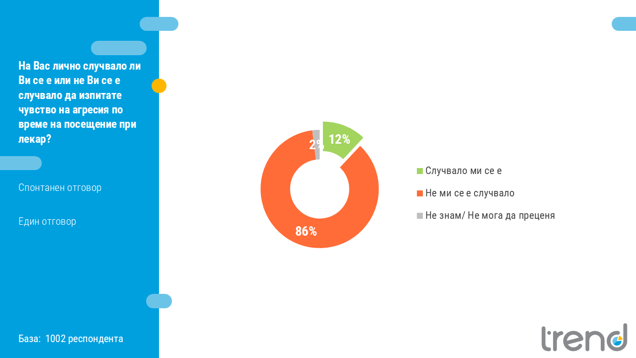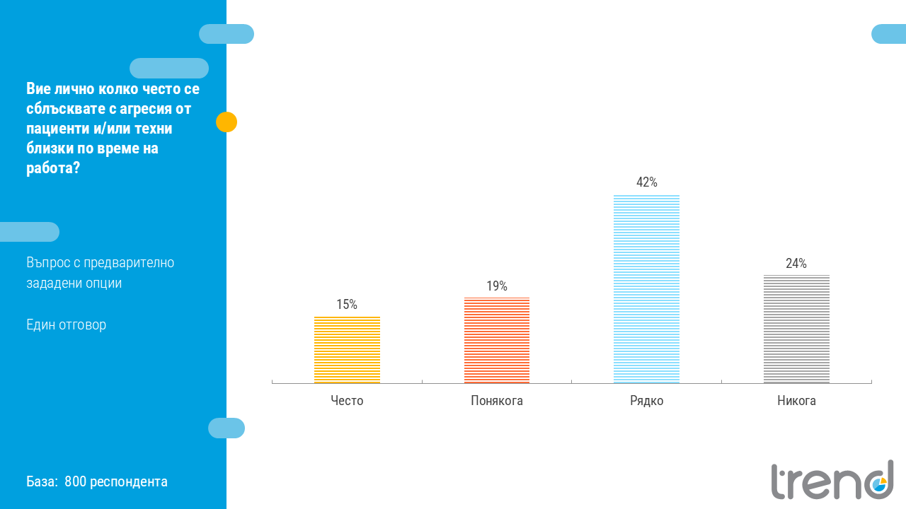 Над половината от лекарите у нас (56%) споделят, че лично са ставали жертва на вербална агресия по време на работа, а 7% (приблизително 350 хиляди души) заявяват, че са ставали жертва на физическа агресия.