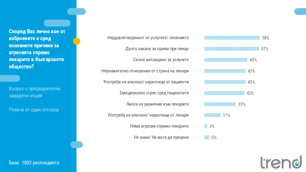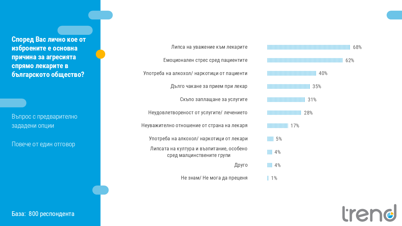 Участниците в проучването посочват като водещи причини за проявите на агресия от страна на пациентите: липсата на уважение към лекарското съсловие (68%), емоционалния стрес сред самите пациенти (62%) и употребата на алкохол или наркотици (40%).