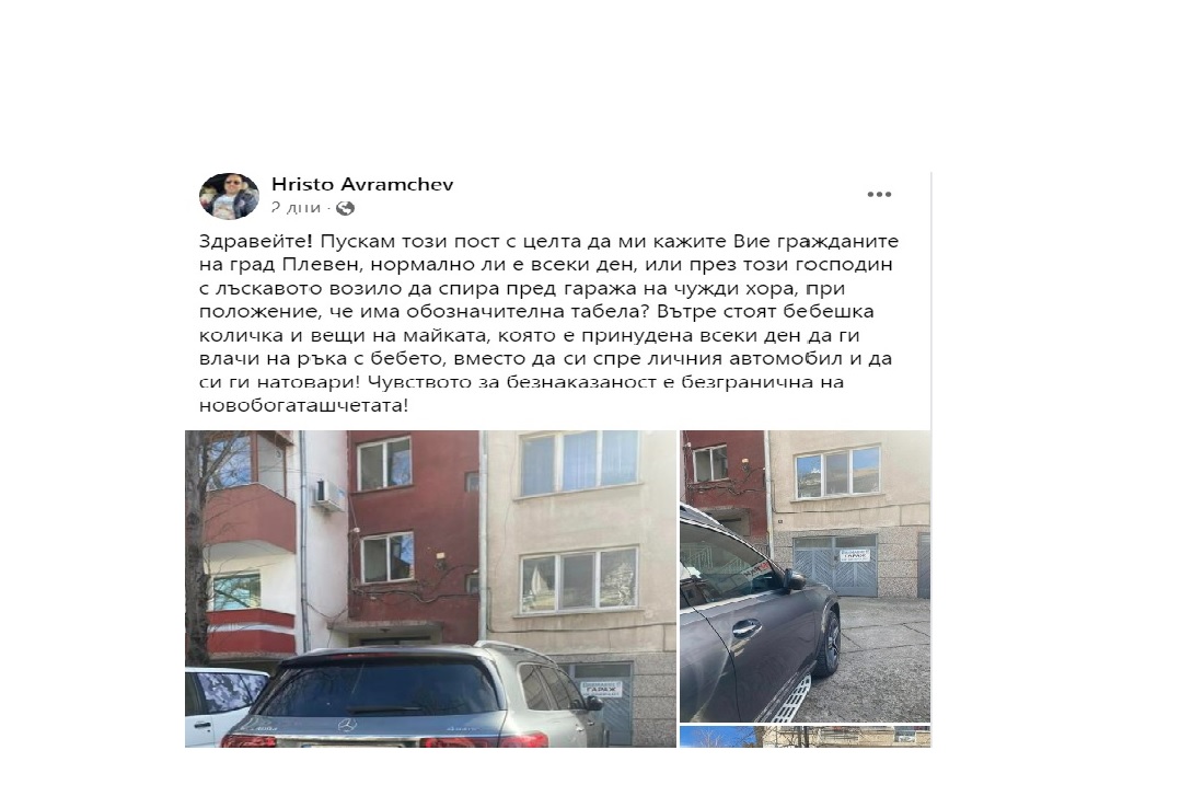 Бизнесменът Христо Аврамчев от Плевен алармира, че Радостин Василев всеки ден спира лъскавия си "Мерцедес" пред гаража му при положение, че има поставена обозначителна табела. Оказва се, че в гаража майка с малко бебе си държи количката и поради поведението на Василев е принудена всеки ден да влачи на ръка детето си, вместо да си ползва собствеността, твърди Аврамчев.