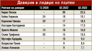 Втора позиция за ПП с 18,4%, но с отлив от 6.0 пункта за два месеца. По-значима е ерозията в персоналния рейтинг на Кирил Петков (от 39% до 22,5%).