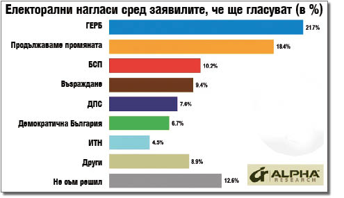 С 21,7% от решилите да гласуват ГЕРБ излиза с над 3 пункта преднина пред ПП, а основен фактор за това разместване е вътрешнопартийната консолидация. Бойко Борисов запазва доверието на 19,1% от пълнолетните българи.