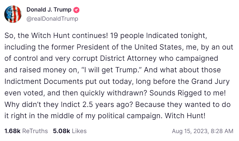 "Що се отнася до обвинителните документи, които бяха публикувани днес много преди голямото жури да гласува и след това документите бяха бързо оттеглени, това ми звучи като фалшификация. Защо не повдигнаха обвинения преди 2,5 години? Защото искаха да го направят в насред политическа кампания. Лов на вещици!", написа Тръмп в социалната мрежа Truth Social.