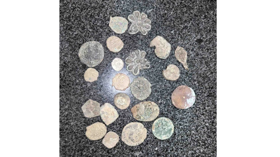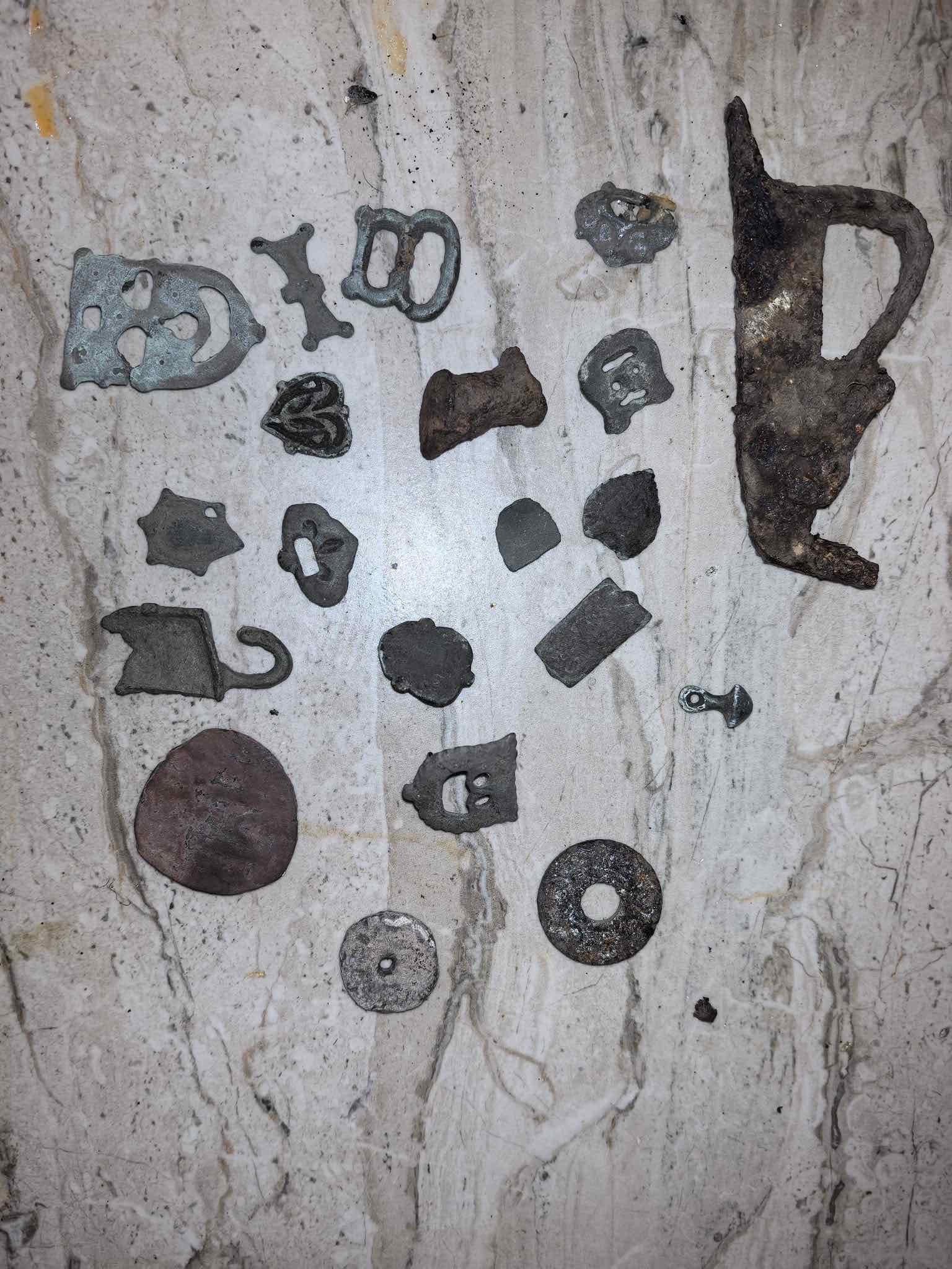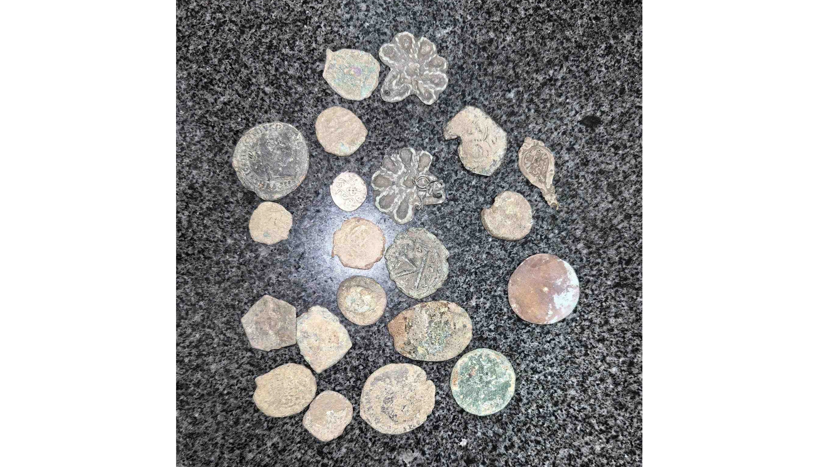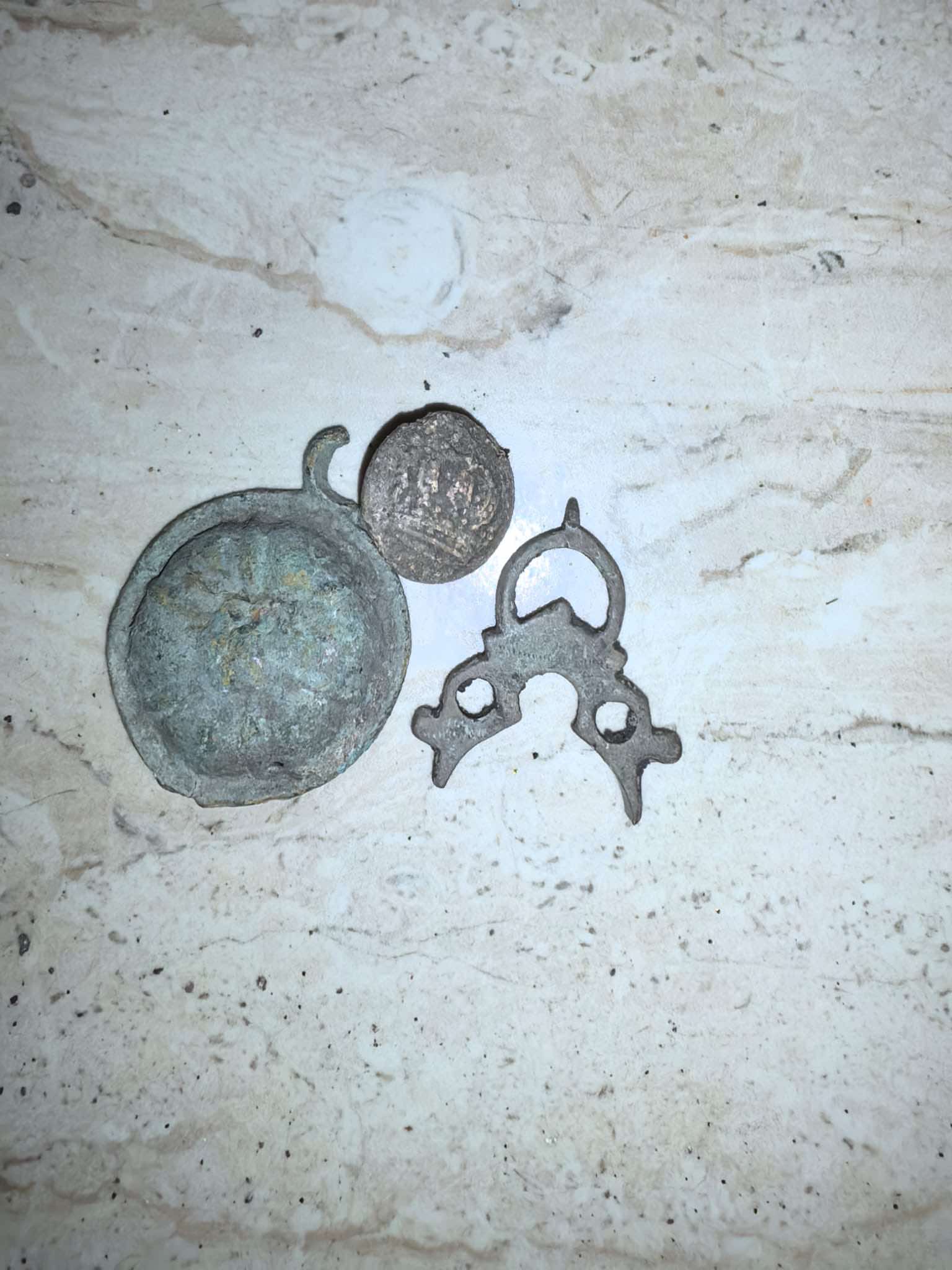 При претърсване в дома на мъжа са открити 18 монети различни по вид и размер, като най - малката била 1 см., а най-голямата - 3,5 см., две метални кръгли шайби с дупка по средата, два метални накита, метално украшение, наподобяващо листо, метално копче, с кукичка за захващане от едната страна с изобразена корона, 14 метални предмети, представляващи накити и части от накити с различна форма и големина и др.