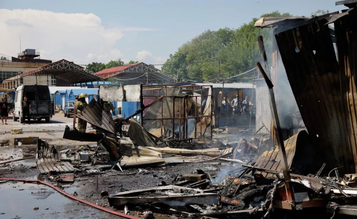 Изпепелените останки от пазара в Донецк, обстрелван днес от украинските сили.