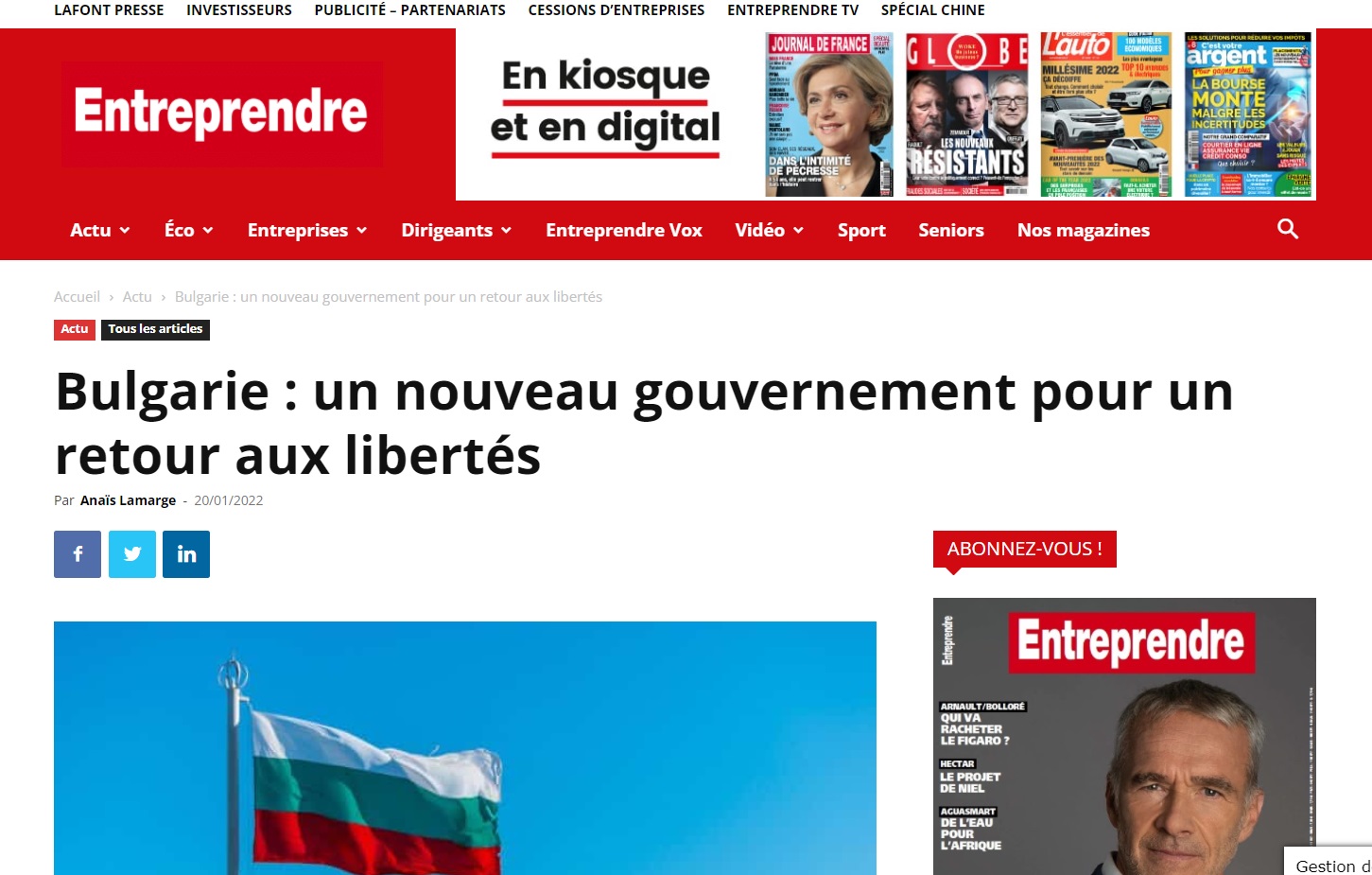 Това пише реномираното френско списание Entreprendre в обширен анализ от миналата седмица, поставящ акцент върху задачите пред новото българско правителство.