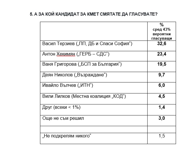 На въпрос "За кой кандидат за кмет смятате да гласувате", 32.6% заявяват, че ще гласуват за Васил Терзиев (ПП-ДБ-"Спаси София"), за Антон Хекимян (ГЕРБ-СДС) - 23.4%, за Ваня Григорова (БСП) - 19.5%, за Деян Николов ("Възраждане") - 9.7%, за Ивайло Вълчев (ИТН) - 6.0%, за Вили Лилков ("КОД") - 4.5%.