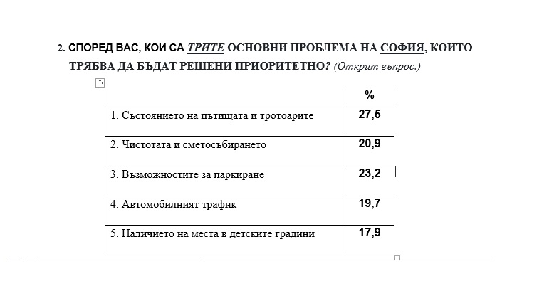 На въпрос кои са трите основни проблема на София, които трябва да бъдат решени приоритетно, 27.5% от анкетираните посочват сред тях състоянието на пътищата и тротоарите, чистотата и сметосъбирането се оценява като проблем от 20.9%, 23.2% посочват, че трябва да се реши проблемът с паркирането и 19.7% отбелязват, че трябва да се реши проблемът с автомобилният трафик. Проблем за софиянци остава и недостигът на места в детски градини и ясли - за 17.9% от интервюираните.