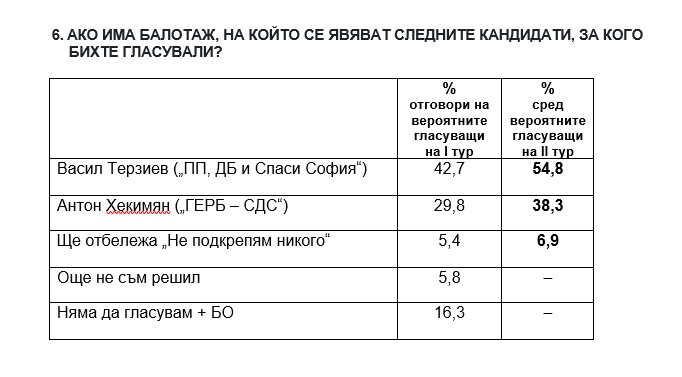 Изследването на Центъра за анализи и маркетинг показва, че в София най-вероятно ще има балотаж между Васил Терзиев и Антон Хекимян, на който ще спечели Терзиев.