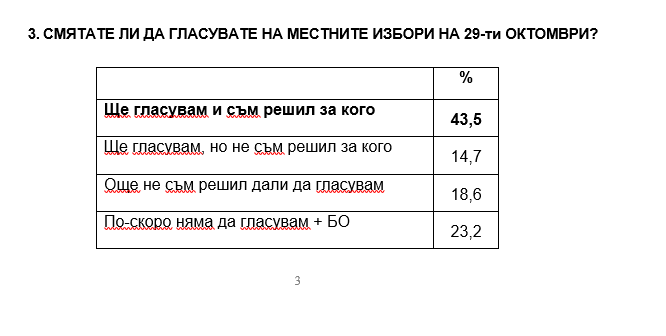43.5% от софиянци ще гласуват на местните избори, които ще се проведат на 29 октомври, и са решили за кого. 14.7% са решили, че ще гласуват, но не знаят за кого, 18.6% още не са решили дали да гласуват и 23.2% декларират, че няма да гласуват.