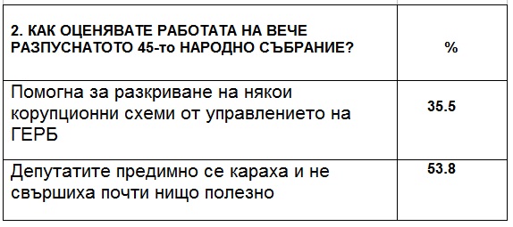 Една трета (35.5%) от участвалите в допитването смятат, че разпуснатото 45-о Народно събрание е помогнало за разкриване на някои корупционни схеми, но над половината (53.8%) са на мнение, че депутатите не са свършили почти нищо полезно.