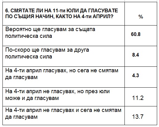 60% от анкетираните заявяват, че на предсрочните парламентарни избори ще гласуват по същия начин както на редовния вот, който се проведе на 4 април.