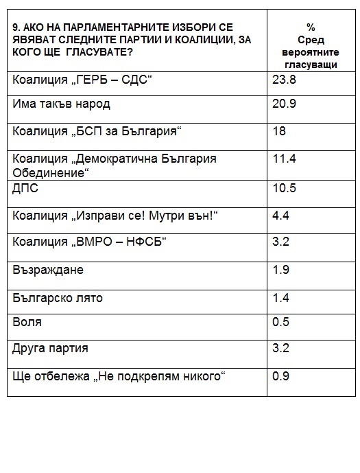 В парламента биха влезли още: "Демократична България" - с 11.4%, ДПС - 10.5 % и "Изправи се! Мутри вън!" с 4.4% подкрепа.