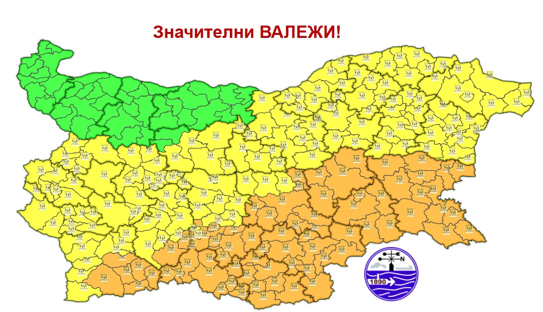 Предупредителни кодове за очаквани значителни валежи са обявени за почти цялата територия на страната с изключение на крайните северозападни райони.