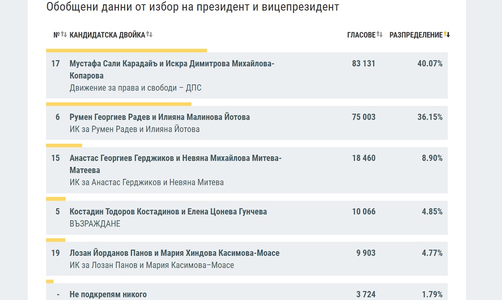 Румен Радев и Илияна Йотова остават на второ място с 36,15 на 100 от гласовете.