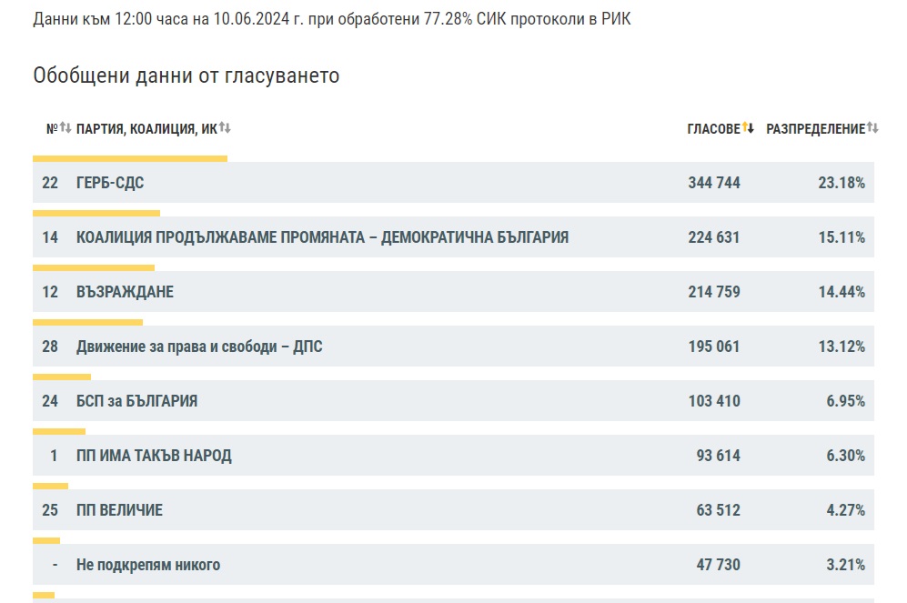 ГЕРБ-СДС получава 24.08%, ДПС - 15.85%, ПП-ДБ - 14.99%, "Възраждане" - 14.26%, БСП - 6.93%, ИТН - 6.21% - "Величие" - 4.91% от гласовете във вота за Народно събрание. Това показват данните, публикувани от ЦИК при обработени в районните избирателни комисии 77.87% от протоколите на секционните избирателни комисии.