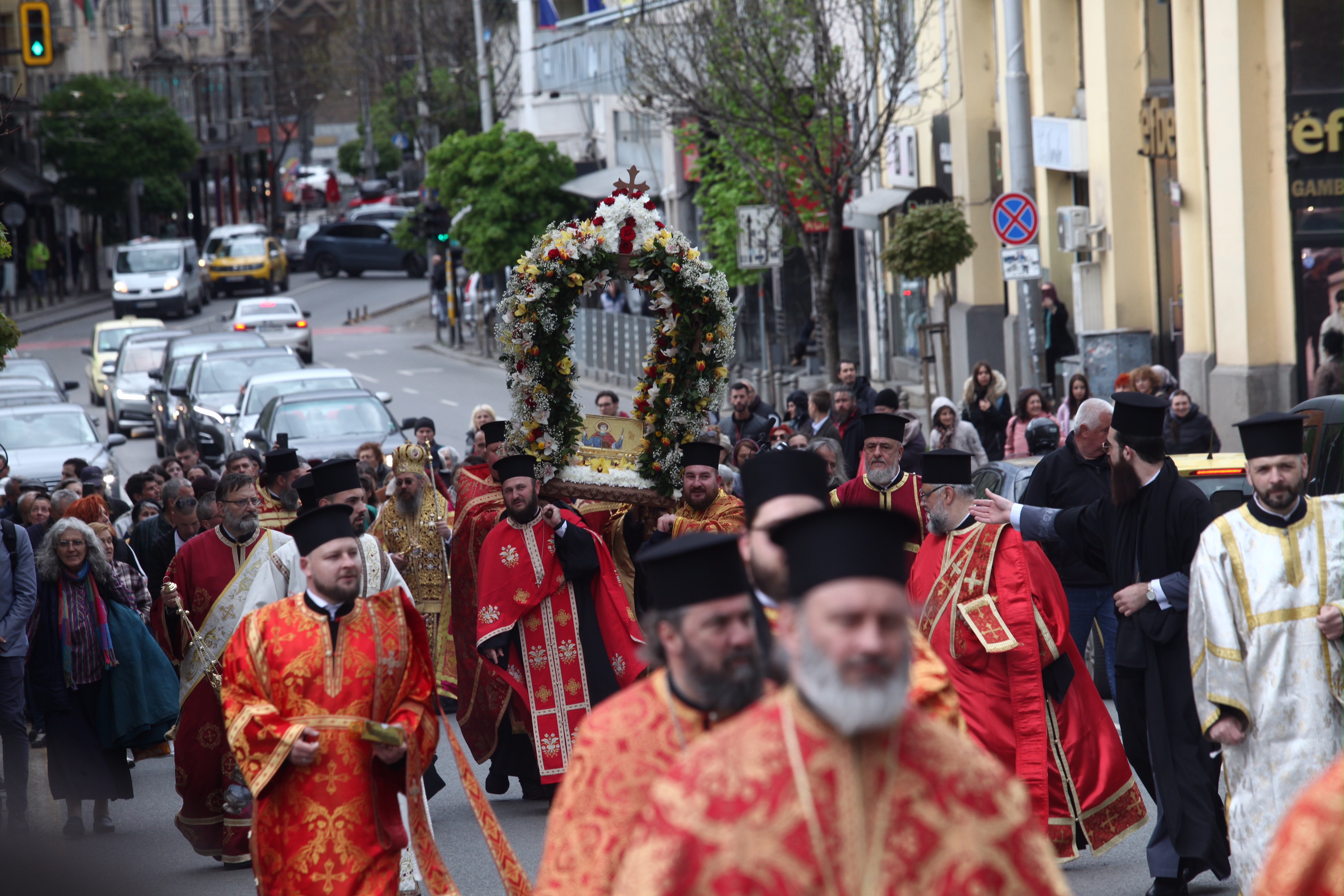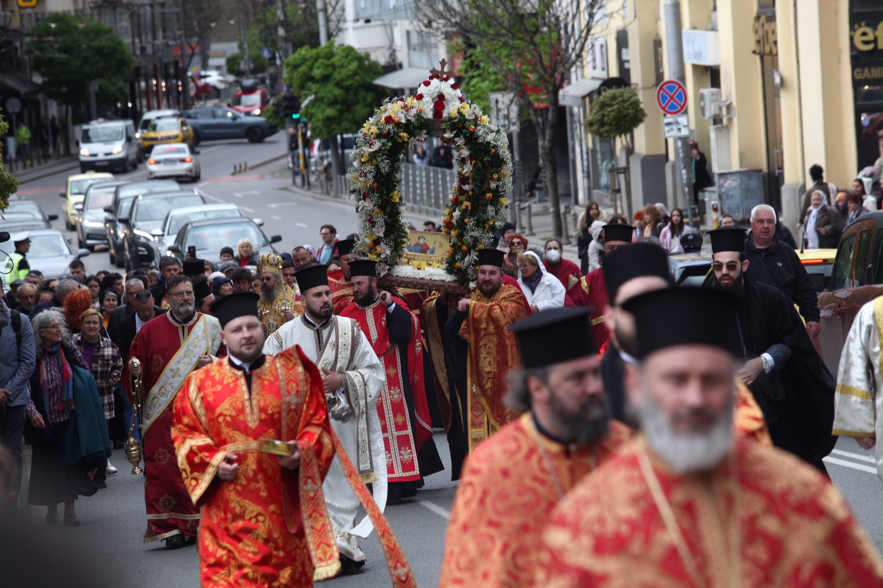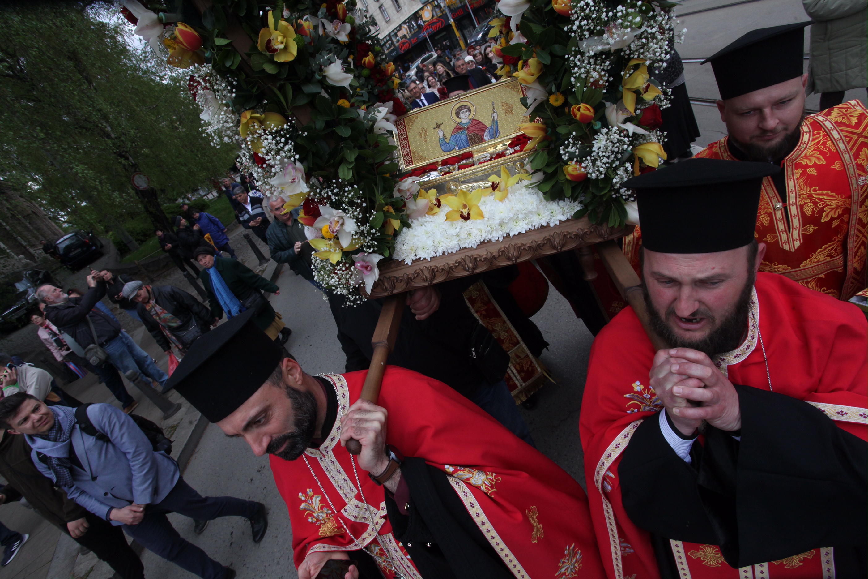 Десетки граждани се бяха събрали пред митрополитската църква "Света Марина", откъдето тръгна литийно шествие, на което мощите на великомъченика бяха отнесени за всенародно поклонение в църквата "Света София". Там мощите ще останат до 28 април.