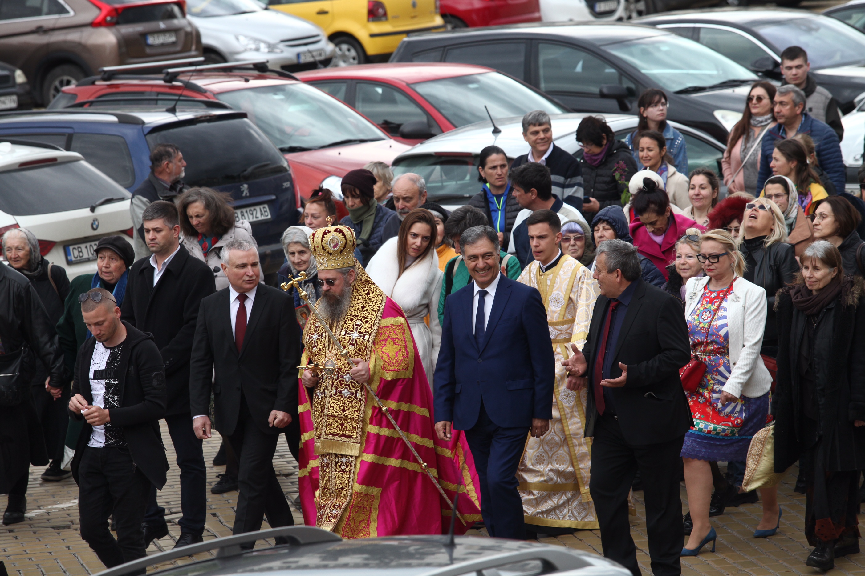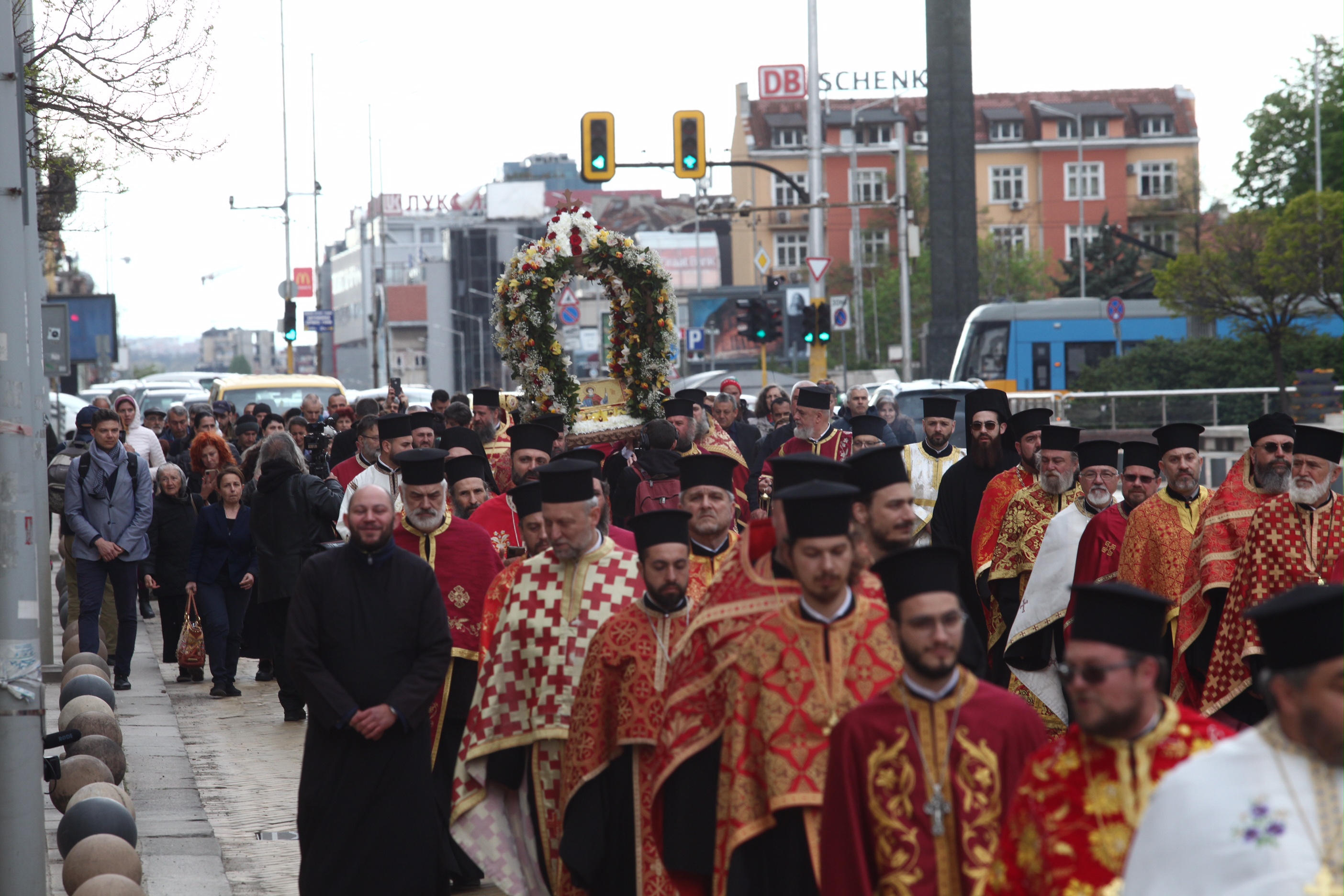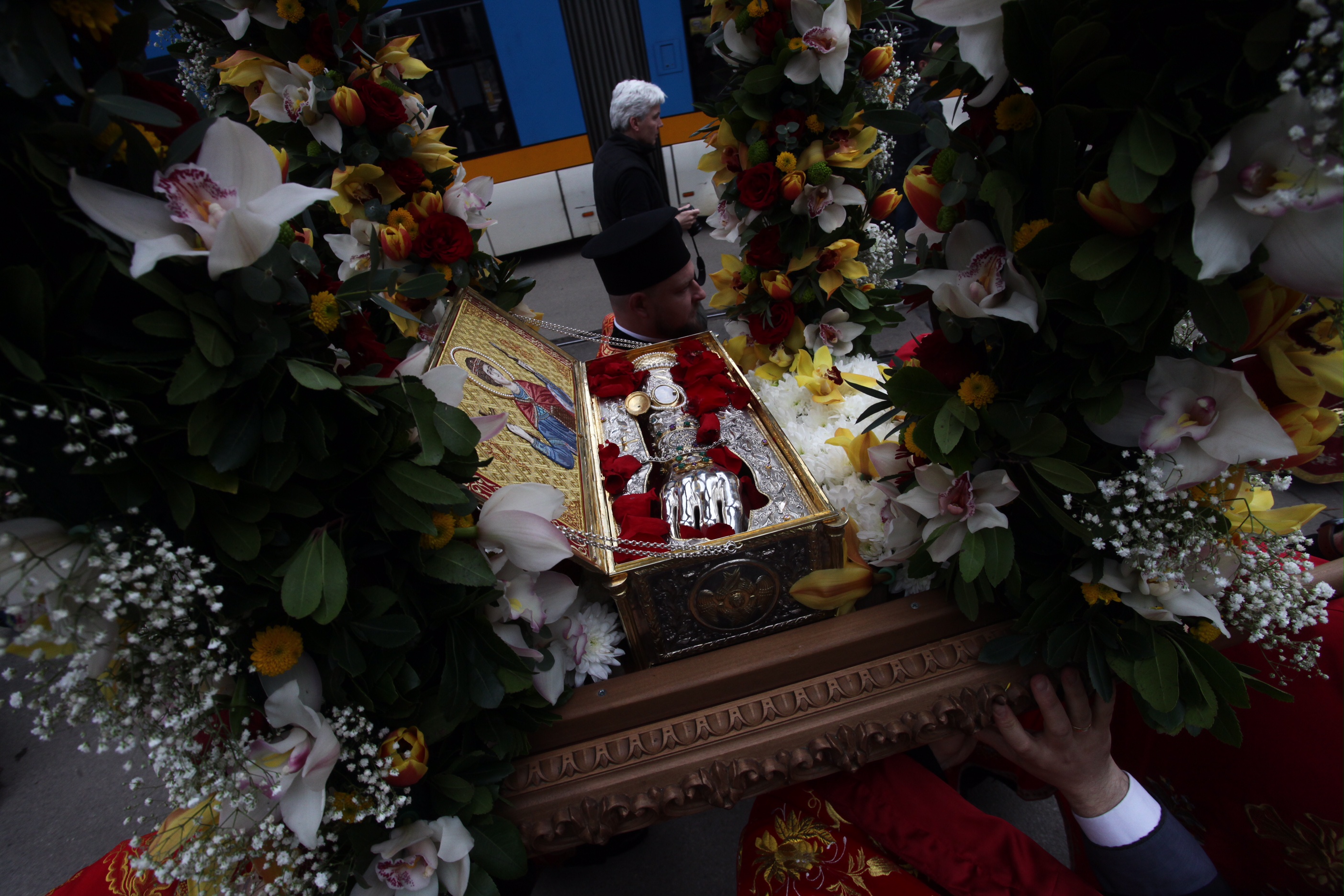 Десетки граждани се бяха събрали пред митрополитската църква "Света Марина", откъдето тръгна литийно шествие, на което мощите на великомъченика бяха отнесени за всенародно поклонение в църквата "Света София". Там мощите ще останат до 28 април.