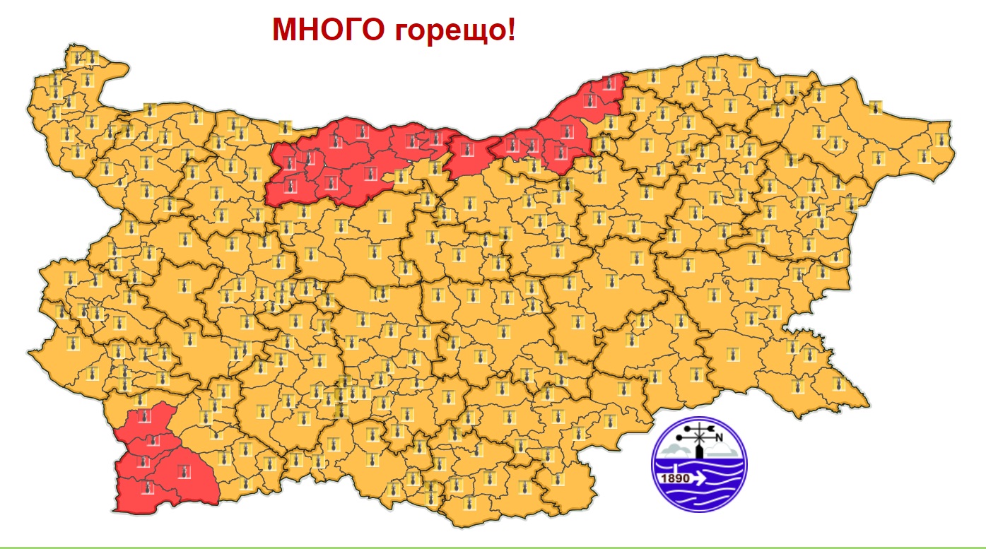 В останалите области на страната в сила е оранжев предупредителен код за горещини, като там живакът ще достигне до 37°-41° по Целзий.