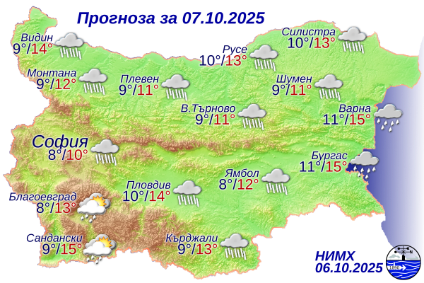 През деня ще духа умерен и временно силен вятър. Минималните температури ще бъдат между 6° и 11°, максималните - между 10° и 15°, за София – около 10°.