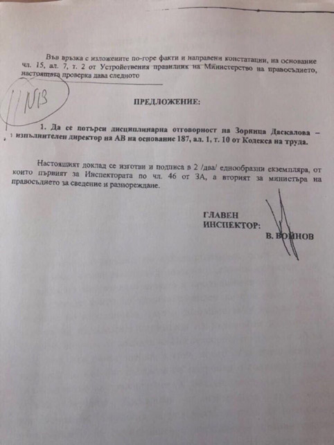 През декември месец миналата година Инспекторатът на правосъдното министерство е направил проверка на шефа на Агенцията по вписванията Зорница Даскалова. Повод е бил сигнал срещу нея от Гергана Пейчевска, която била уволнена от Даскалова. В него тя твърди, че не са предприети действия за провеждане на конкурси за назначаване на длъжностни лица по Закона за търговския регистър и регистъра на юридическите лица с нестопанска цел. Посочено е, че през декември служители на Агенцията са полагали извънреден труд, което е вариант за разпределяне на пари в края на годината. Твърди се, че Даскалова е издавала нареждания какво да се постанови по партидата на конкретна фирма. Проверката на инспектората завършва с предложение за дисциплинарно наказание на Даскалова.