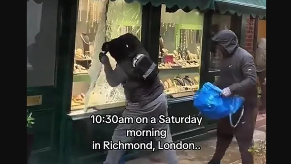 Robbers casually smashing a jewellery shop in broad daylight in the affluent residential district of Richmond, London, 🇬🇧