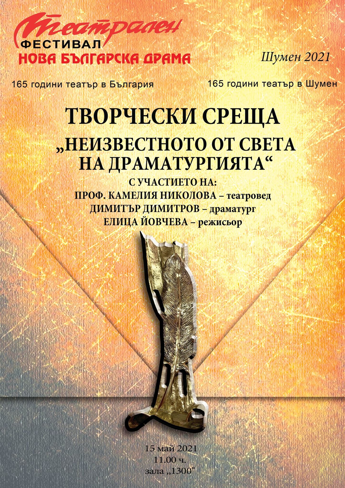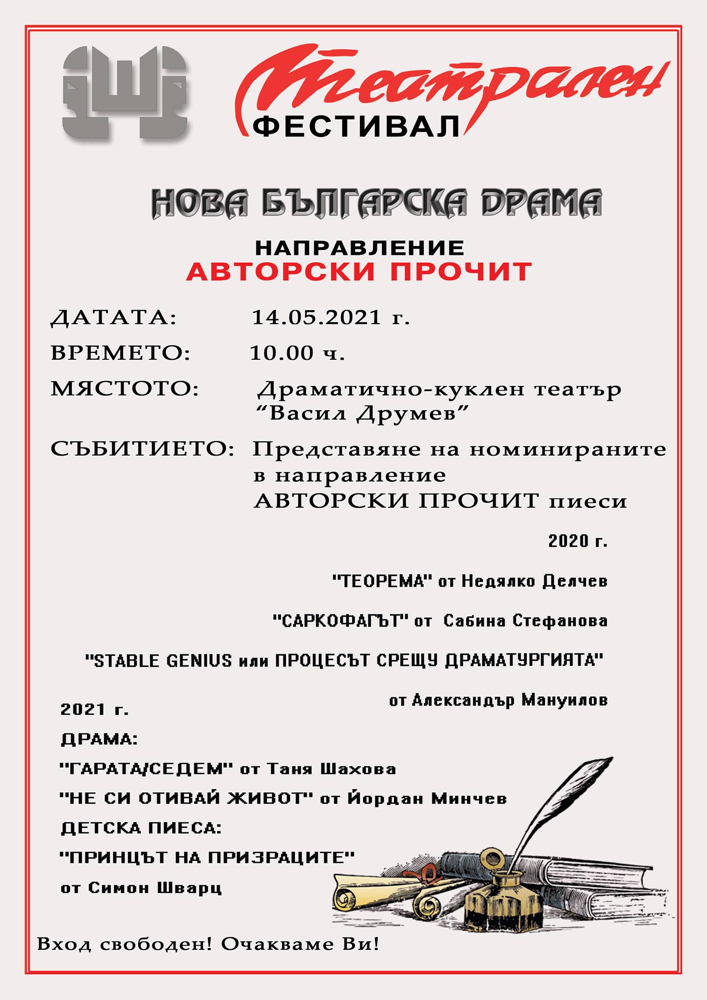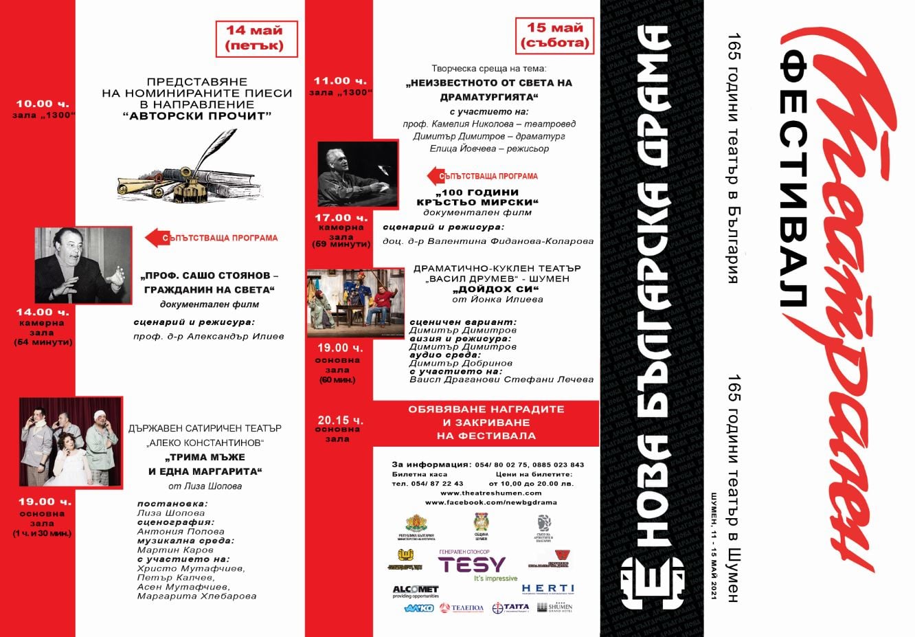 Шумен събира знакови имена за театралното изкуство от 11 до 15 май и ще бъде единствен домакин в страната на театрален фестивал тази година. След прекъсване през 2020-та заради пандемията, тази пролет ще има "Нова българска драма" и на сцената на ДКТ "Васил Друмев" ще бъде представено най-доброто от българската драматургия през 2020 и 2021 г. Официалното откриване идния вторник, в Деня на Шумен, е със спектакъла "Задявки надигравки" от Съби Събев на открито, тържествено издигане на театралната хоругва и поднасяне на цветя пред паметниците на Добри Войников и Васил Друмев. /Виж програма/