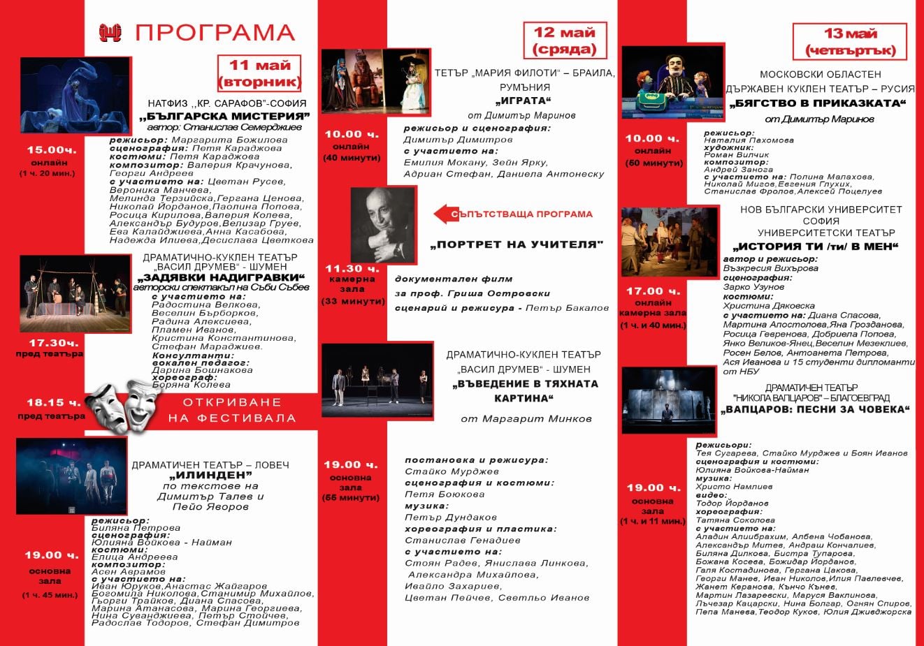 Ще се състезават пет спектакъла, селектирани от проф.Ромео Попилиев: "Илинден" по текстове от Димитър Талев и Пейо Яворов, на Драматичен театър Ловеч; "Въведение в тяхната картина" от Маргарит Минков на Драматично-куклен театър "Васил Друмев" - Шумен; "Вапцаров: Песни за човека" на Драматичен театър "Н.Вапцаров" - Благоевград; "Трима мъже и една Маргарита" от Лиза Шопова на Сатиричен театър "Алеко Константинов" - София и "Дойдох си" от Йонка Илиев на шуменския театър. Всички постановки ще се играят в голяма зала при спазване на противоепидемични мерки.