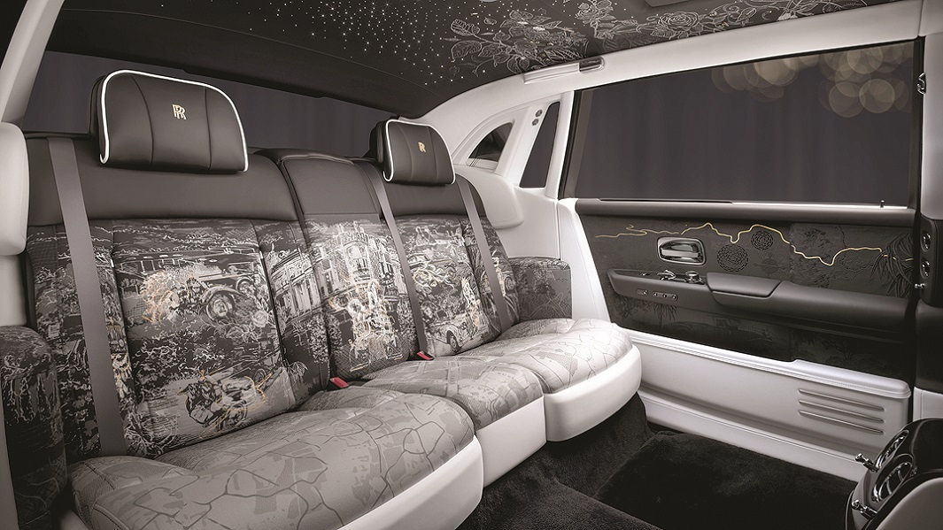 Интериорът изглежда като луксозна библиотека от махагон, коприна и история. Всяка повърхност разказва някакъв епизод от 100-годишната летопис на модела. Седалките отзад представляват “гоблен” от 45 отделни панела с изображения от 160 000 шева на седем легендарни собственици на Phantom и ключови моменти от вековната история.