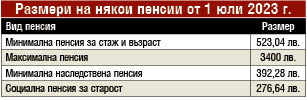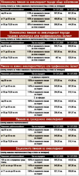 С вдигането на минималната и на социалната пенсия за старост автоматично нарастват и редица други пенсии, които се определят от тях. Например минималните пенсии за инвалидност поради общо заболяване и за инвалидност поради трудова злополука или професионална болест, пенсиите за военна инвалидност и за гражданска инвалидност, социалната пенсия за инвалидност. Ще бъдат увеличени и редица добавки към пенсиите, които се определят в процент от социалната пенсия за старост. Например пенсионерите с трайно намалена работоспособност/вид и степен на увреждане над 90 на сто, които постоянно се нуждаят от чужда помощ, получават към определената им пенсия добавка в размер 75 на сто от социалната пенсия за старост. От 1 юли тази добавка ще стане 207,48 лв.